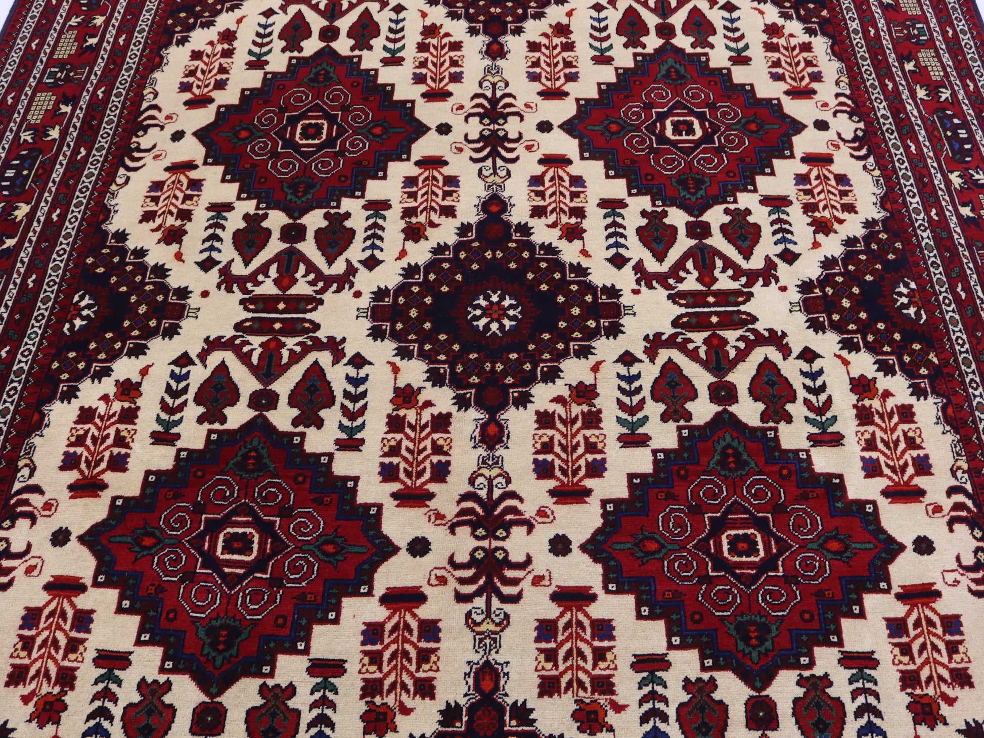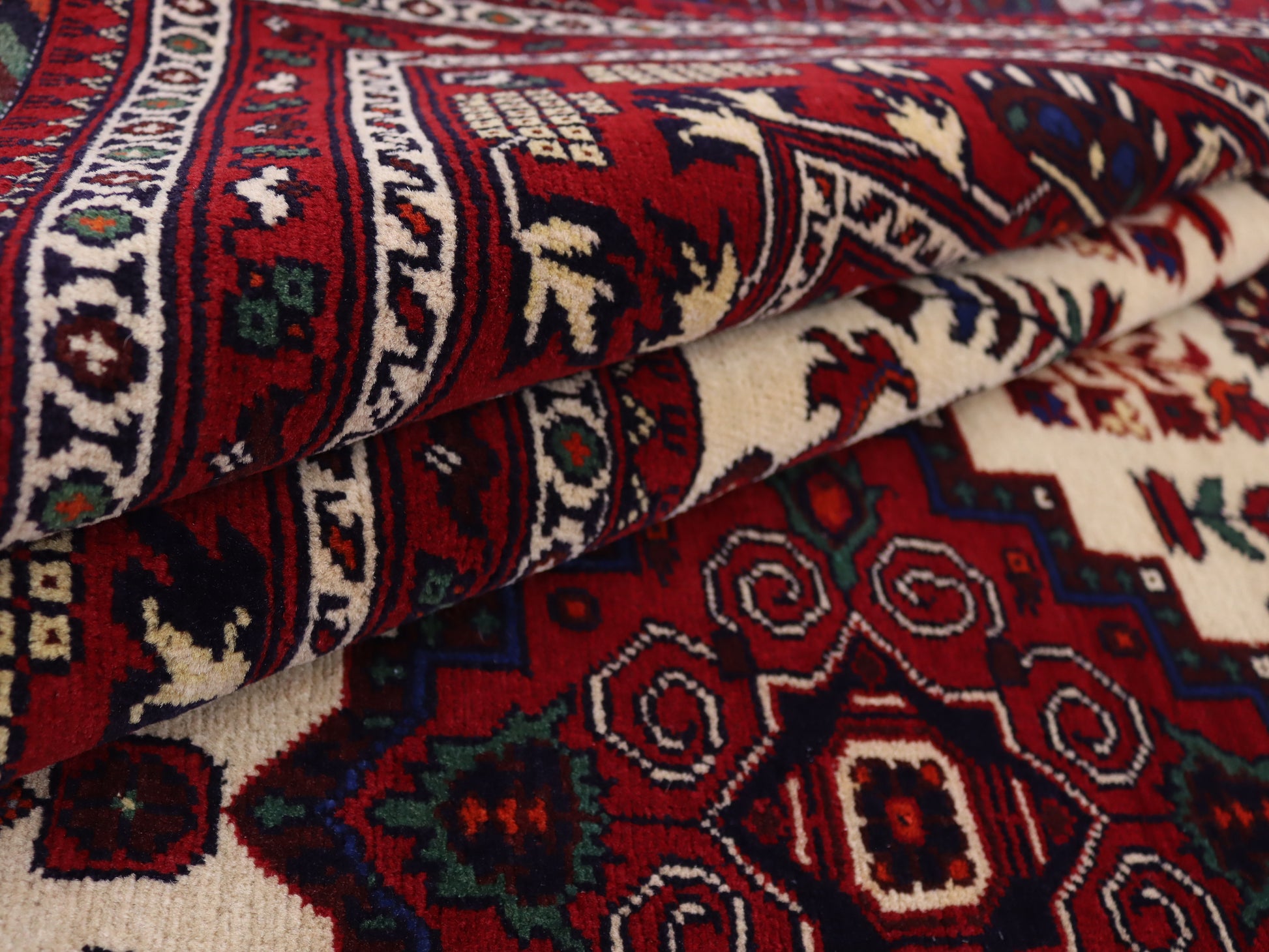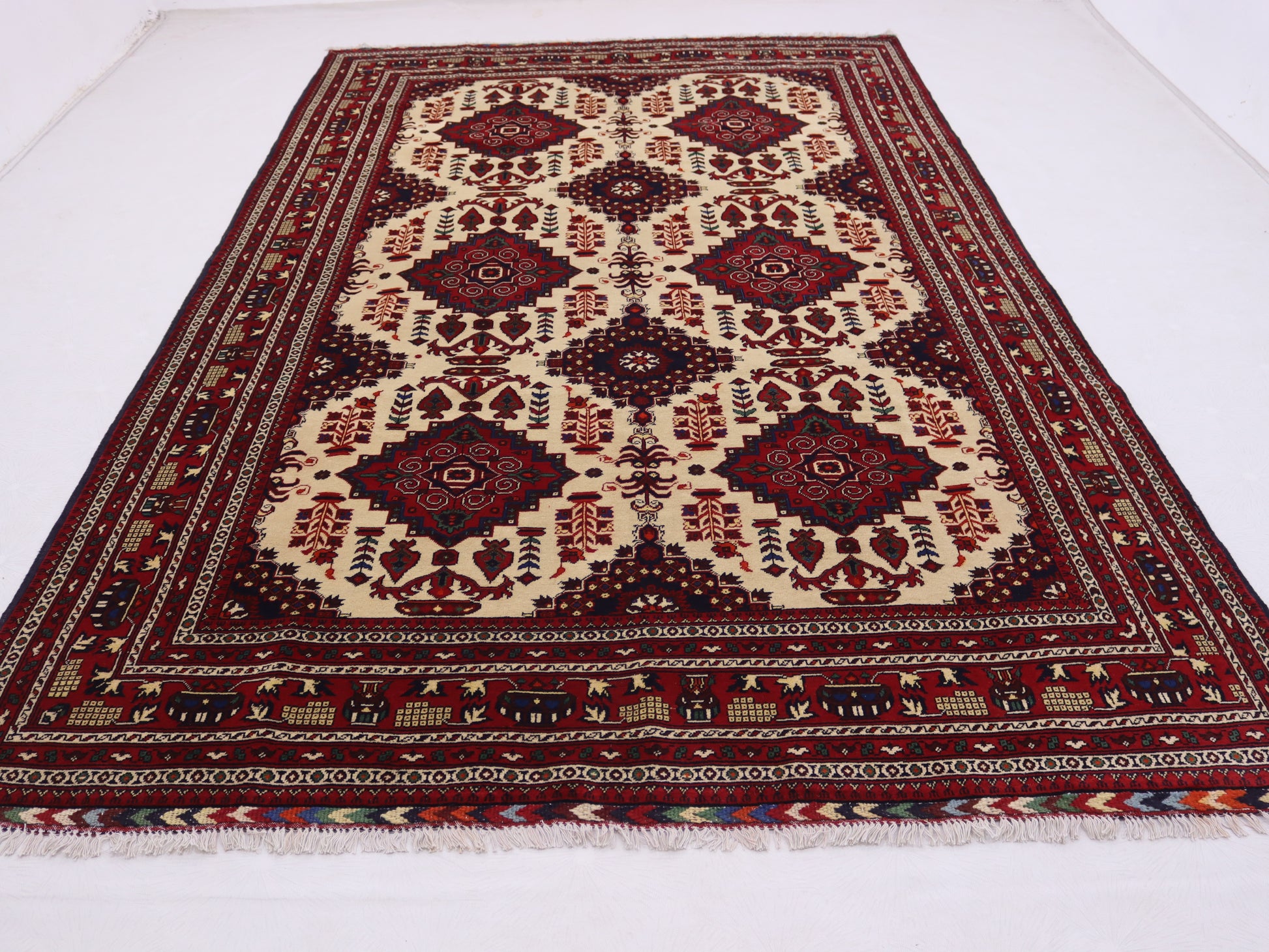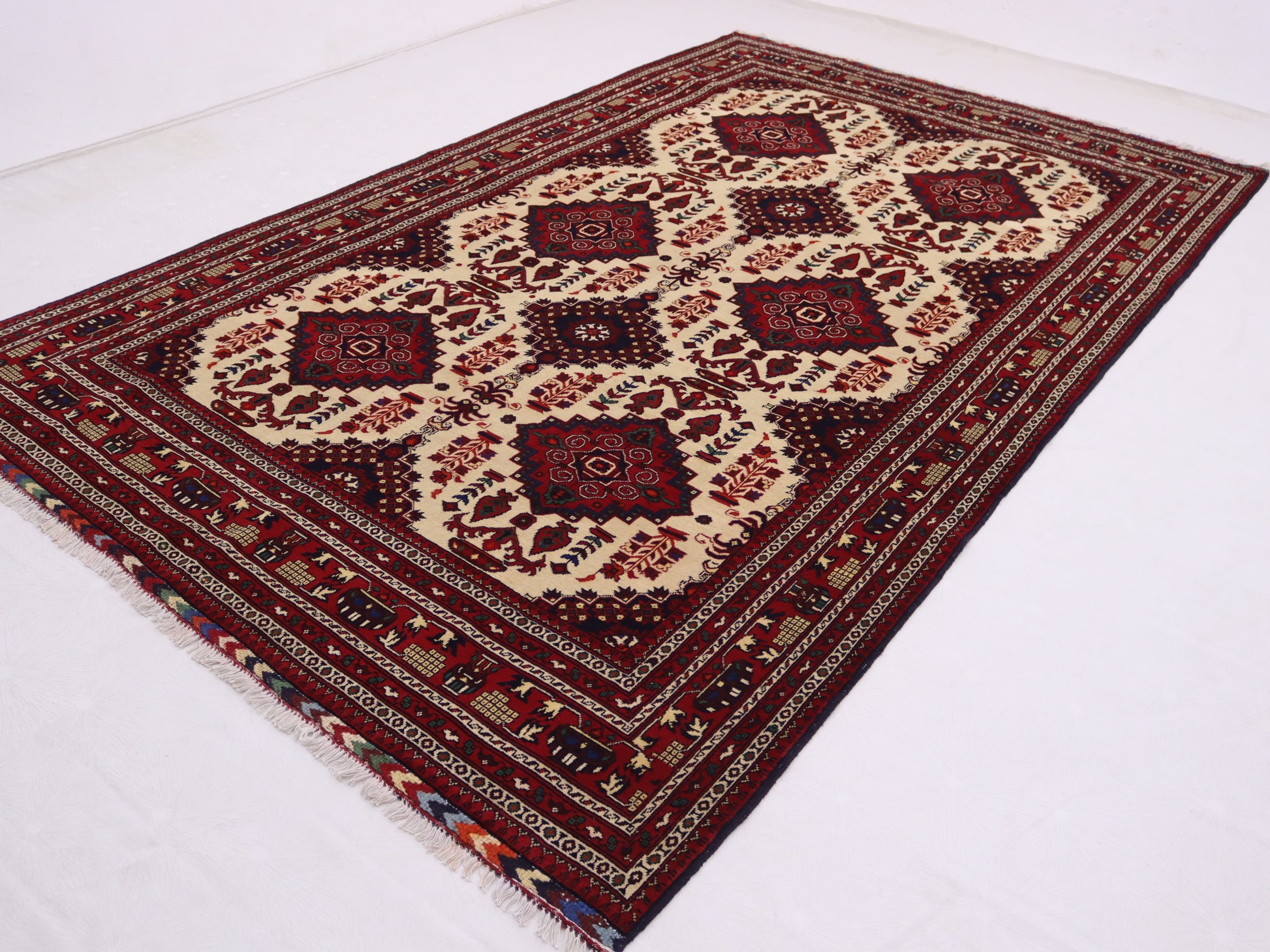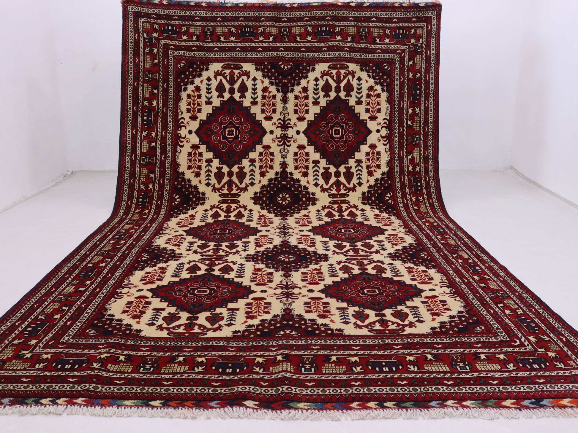 This Handmade Afghan geomatric zirkhaki Rug is a true piece of art, handmade in Mazar-i-Sharif, Afghanistan. Featuring a bold red and navy blue white color palette, this rug showcases geomatric zirkhaki motifs known for their elegance and symmetry.